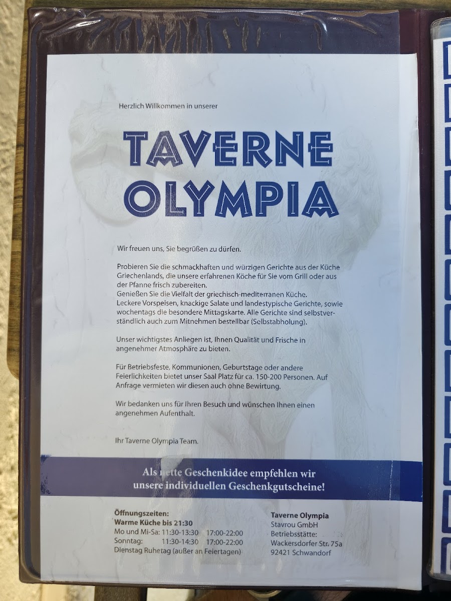 Welcome to Taverne Olympia, a quaint culinary gem nestled in Schwandorf at Wackersdorfer Str. 75A. This warm and cozy haven is truly a sanctuary for food enthusiasts. Patrons rave about the savory dishes, including an exquisite Lammhaxe, noted for its tenderness and perfect seasoning, alongside delectable spaghetti. The inviting atmosphere, complemented by friendly service, creates a perfect setting for a relaxed dining experience.